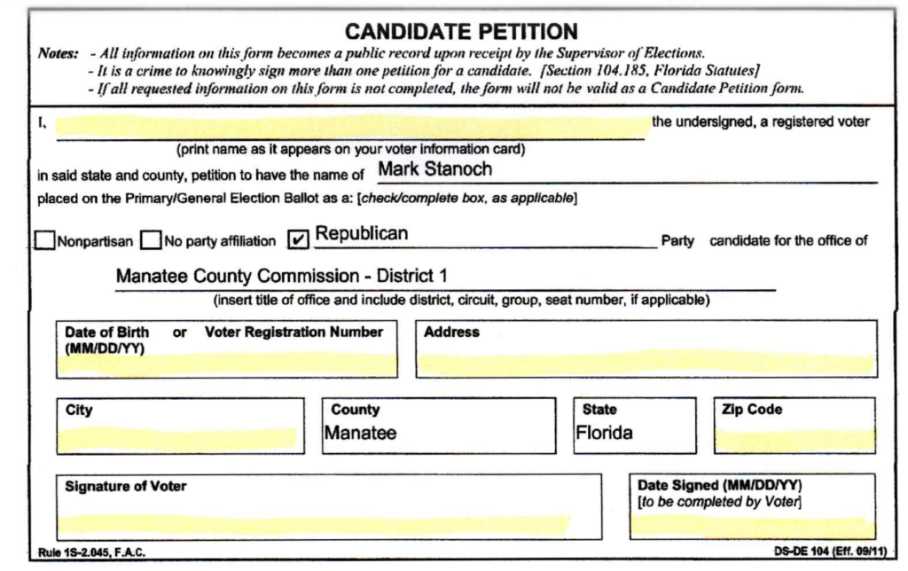 You can help me get on the ballot this August. If you live in District 1, please click on the image of the Candidate Petition form on the left to download the form. Please complete, sign and date it, and mail it to the address below. To see whether you reside in District 1, just click on the button below. You will be directed to the Manatee County Supervisor of Elections site. Follow the instructions on that site to find out your precinct and district. Thanks for your support!